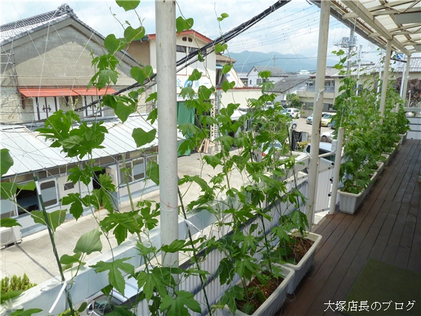 立派なグリーンカーテンになって欲しいのはもちろんですが、きれいな花と大きな実がつくといいなあ。(^―^)