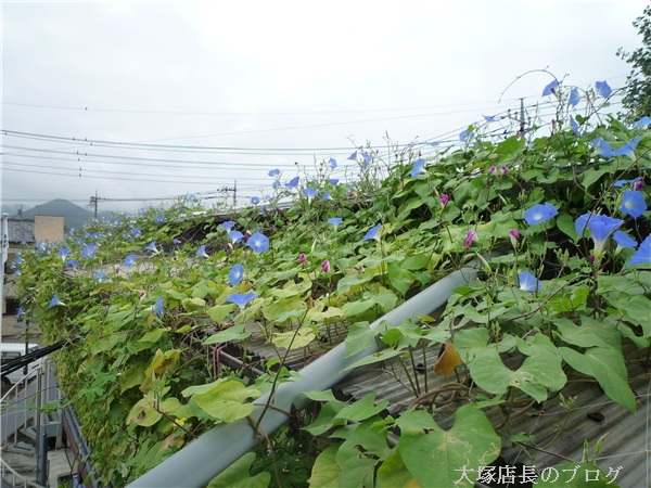 事務所の屋根の上を覗いてみたら、朝顔がたくさん咲いていました。(⌒▽⌒)ノ