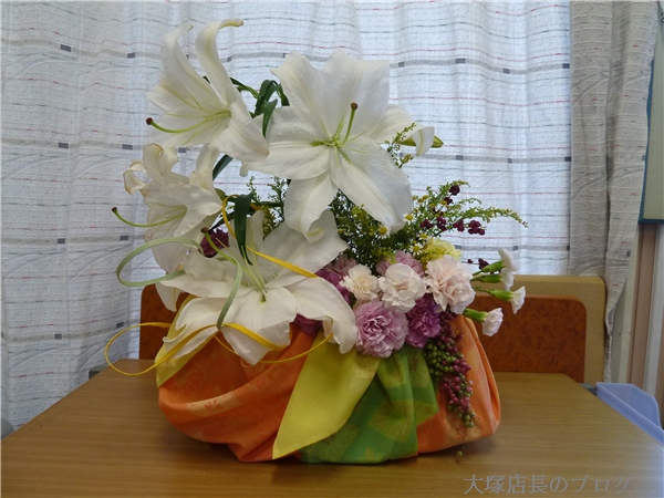 先日、超撥水風呂敷ながれがグッドデザイン・中小企業庁長官賞を受賞しましたが、そのお祝いに素敵なお花を頂きましたので、ご紹介します。